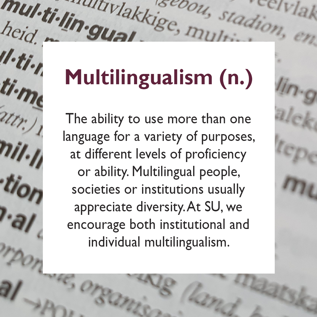 Our focus at SU is not only on institutional multilingualism, but also on individual multilingualism. In other words, we do not focus only on establishing multilingual spaces at the University (through translation and interpreting, for example) where a diverse group of monolingual people co-exist, but we actively encourage people to use more than one language, even if they can say and understand only a little in some of those languages.