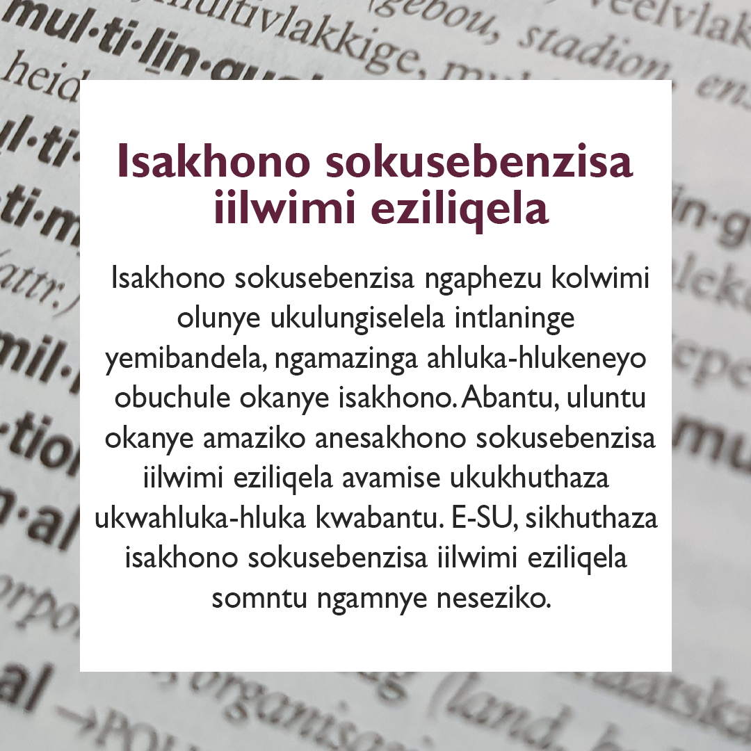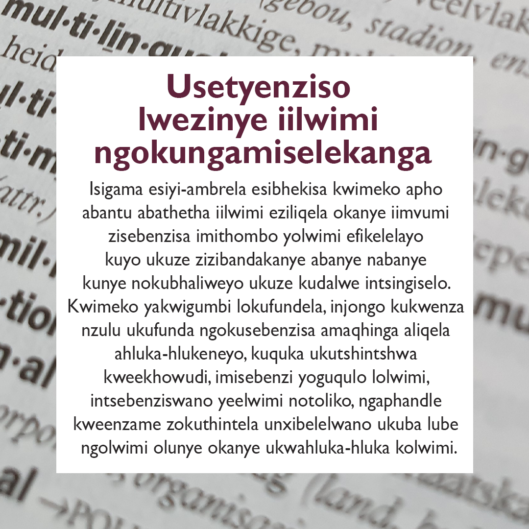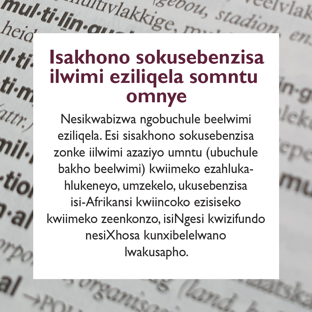Indlela yokucinga engeelwimi eziliqela Indlela yokucinga engeelwimi eziliqela Njengeyunivesithi ehamba phambili e-Afrika, iYunivesithi yaseStellenbosch ikholelwa ekubeni isakhono sokusebenzisa iilwimi eziliqela sibalulekile. Sikholelwa ekubeni isakhono sokusebenzisa iilwimi eziliqela asikokwazi nje ukusebenzisa iilwimi ngeelwini. Simalunga nokuliqonda ixabiso laloo nto ithethwayo, kungakhathalisekile nokuba setyenziswa oluphi ulwimi nokuba okok kuthethwa ngesiNgesi, isiAfrikansi, isiXhosa okanye ngoLwimi lweZandla lwaseMzantsi Afrika.